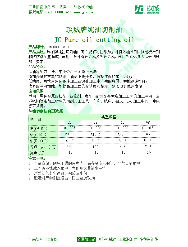 产品描述;玖城牌纯油切削油由高性能矿物油添加多种特效油性剂、抗磨极压剂和防锈剂配置而成。适用于各种有色金属及黑色金属,使用性能达到大部分切削加工要求。